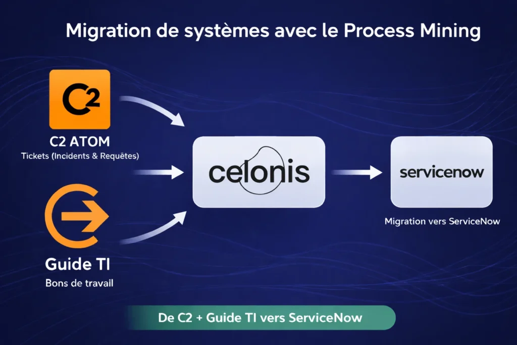 Ce projet illustre l’intérêt du process mining avec Celonis dans une migration de systèmes : connecter des sources “on-premise” (C2 et Guide TI), reconstruire les parcours réels à partir des statuts et groupes d’affectation, puis utiliser cette vision pour préparer une migration vers ServiceNow plus fiable. Le point clé côté ITSM a été la transition d’un C2 où incidents et requêtes cohabitent dans un même module (distingués par un champ) vers une organisation ServiceNow naturellement séparée. Résultat : une migration mieux maîtrisée et un modèle plus lisible pour les équipes.